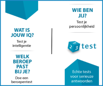 123test is hét startpunt voor persoonlijke ontwikkeling. Onze tests geven onder andere inzicht in je carrière- en studiemogelijkheden, IQ en persoonlijkheid zodat jij nog betere keuzes kunt maken. Dagelijks bezoeken wereldwijd bijna 100.000 mensen de websites van 123test en maandelijks worden rond de 1,5 miljoen tests ingevuld.